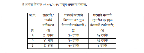 तथापि X, Y a Z वर्गीकृत शहरांना अनुक्रमे किमान रु.५४००, रु.३६०० व रु.१८०० इतका घरभाडे भत्ता अनुज्ञेय राहील. ज्यावेळी सातव्या वेतन आयोगानुसार अनुज्ञेय केलेला महागाई भत्ता हा २५ टक्क्याची मर्यादा ओलांडेल त्यावेळी वरीलप्रमाणे वर्गीकृत शहरांना अनुक्रमे २७%, १८% व ९% दराने घरभाडे भत्ता मंजूर करण्यात यावा. तसेच ज्यावेळी सातव्या वेतन आयोगानुसार मिळणारी महागाई भत्त्याची रक्कम ही ५० टक्क्यापेक्षा अधिक होईल त्यावेळी वरीलप्रमाणे वर्गीकृत शहरांना, अनुक्रमे ३०%, २०% व १० % अशा वाढीव दराने, घरभाडे भत्ता मंजूर करण्यात यावा. सुधारीत दराने घरभाडे भत्त्याची परिगणना करण्यासाठी मूळ वेतनामध्ये, “विशेष वेतन” इत्यादी सारख्या वेतनाचा समावेश नसेल. २. घरभाडे भत्त्याच्या अनुज्ञेयतेसंबंधीच्या विद्यमान आदेशातील इतर सर्व तरतूदी व अटी जशाच्या तशा लागू राहतील. ३. शासकीय कर्मचाऱ्यांच्या बाबतीत या आदेशाच्या परिणामी होणारा घरभाडेभत्त्यावरील वाढीव खर्च हा त्यांचे वेतन व भत्ते यासंबंधिचा खर्च ज्या संबंधित लेखाशिर्षाखाली खर्ची टाकण्यात येतो, त्याच लेखाशिर्षाखाली खर्ची टाकण्यात यावा. अनुदानप्राप्त संस्था व जिल्हा परिषदा यांच्या कर्मचाऱ्यांच्या बाबतीत घरभाडेभत्त्यावरील खर्च संबंधित प्रमुख लेखाशिर्षाखाली, ज्या उपलेखाशिर्षाखाली त्यांच्या सहायक अनुदानाचा खर्च खर्ची टाकण्यात येतो. त्या उपलेखाशिर्षाखाली खचर्ची टाकण्यात यावा. सर्व विभागप्रमुख, सर्व जिल्हा परिषदांचे मुख्य कार्यकारी अधिकारी आणि कृषि व कृषितर विद्यापिठांचे कुलसचिव यांनी याबाबत होणारा जादा खर्च सुधारीत अंदाजपत्रक तयार करतांना विचारात घ्यावा. ४. स्थानिक पुरक भत्ता व वाहतूक भत्ता हे दोन्ही भत्ते हे ६ व्या वेतन आयोगाच्या कालावधीत, ज्या दराने अदा करण्यात येत होते, त्याच दराने अदा करण्यात यावेत. ५. हे आदेश दि. ०१.०१.२०१९ पासून अंमलात आले आहेत असे समजण्यात यावे.