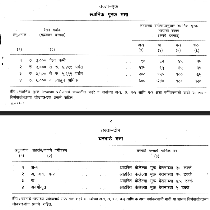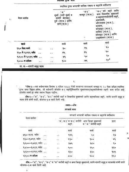 २. सुधारित दराने घरभाडे भत्त्याची परिगणना करण्याच्या प्रयोजनार्थ मूळ वेतनात विहित वेतन बॅन्ड मधील आहरित करीत असलेले वेतन आणि अनुज्ञेय ग्रेड वेतनाचा समावेश होईल. मात्र त्यामध्ये ” विशेष येतन” इत्यादी सारख्या वेतनाचा समावेश नसेल. उच्च प्रशासकीय श्रेणी +( एचएजी + ) वेतनश्रेणीतील शासकीय कर्मचाऱ्यांच्या बाबतीत मूळ घेतन म्हणजे विहित श्रेणीतील येतन असेल. परंतु, जे कर्मचारी असुधारित वेतनश्रेणीत येतन घेतील, त्यांच्या बाबतीत घरभाडे भत्त्याची परिगणना त्यांचे असुधारित वेतनश्रेणीतील मूळ वेतन, कुंठीत वेतनवाढी आणि महागाई चेतन लक्षात घेऊन करण्यात येईल. ३. शासन असेही आदेश देत आहे की, राज्य शासकीय कर्मचारी व इतरांना स्थानिक पूरक भत्ता हा, ते जणू काही असुधारित वेतनश्रेणीत चेतन घेत आहेत असे मानून त्यांच्या असुधारित वेतनावर आणि संदर्भ क्र. (२) येथील दिनांक ११ डिसेंबर, १९९८ च्या आदेशान्वये विहित केलेल्या दराने व संदर्भ क्र. (४) येथील १७ जून २००५ च्या आदेशातील तरतूदीनुसार विहित केलेले शहरांचे / गावांचे वर्गीकरण लक्षात घेऊन मंजूर करण्याची संदर्भ क्र. (७) येथील दिनांक १३ मे, २००९ च्या आदेशांतील तरतूद यापुढेही चालू राहील. ४. संदर्भ क. (४) येथील दिनांक १७ जून, २००५ च्या आदेशातील परि.३ मधील विद्यमान वर्गीकरणाच्या तुलनेत निम्न वर्गीकरण प्राप्त झालेल्या शहरांचे व गायांचे विद्यमान वर्गीकरण कायम ठेवण्याबाबतच्या तरतूदी यापूढेही चालू राहतील. या तरतुदीन्यये, नयी मुंबई (सी.टी.) [ म्हणजे नवी मुंबई महानगरपालिका क्षेत्राबाहेरील नवी मुंबईचा भाग) येथे विद्यमान (अ-१) वर्गीकरणानुसार सुधारित “एक्स” वर्गीकृत शहरी लागू असलेल्या दराने तसेच, कामठी नागरी समूहातील कामठी (नगरपालिका) आणि कामठी (छावणी) येथे विद्यमान (१) वर्गीकरणानुसार सुधारित “वाय” वर्गीकृत शहरी लागू असलेल्या दराने घरभाडे भत्ता आणि स्थानिक पूरक भत्ता अनुज्ञेय ठरेल. ५. स्थानिक पूरकभत्ता व घरभाडे भत्त्याच्या अनुज्ञेयतेसंबंधीच्या विद्यमान आदेशातील इतर सर्व तरतूदी व अटी जशाच्या तशा लागू राहतील. ६.शासकीय कर्मचान्यांच्या बाबतीत या आदेशाच्या परिणामी होणारा घरभाडे भत्त्यावरील याढीव खर्च हा त्यांचे वेतन व भत्ते या संबंधीचा खर्च ज्या संबंधित लेखाशीर्षाखाली खर्ची टाकण्यात येतो त्याच लेखाशीर्षाखाली खर्ची टाकण्यात यावा. अनुदानप्राप्त संस्था व जिल्हा परिषदा यांच्या कर्मचाऱ्यांच्या बाबतीतील खर्च संबंधित प्रमुख लेखाशीर्षाखाली ज्या उपलेखाशीर्षाखाली त्यांच्या सहायक अनुदानाचा खर्च खर्ची टाकण्यात येतो, त्या उपलेखाशीर्षाखाली खर्ची टाकण्यात यावा.